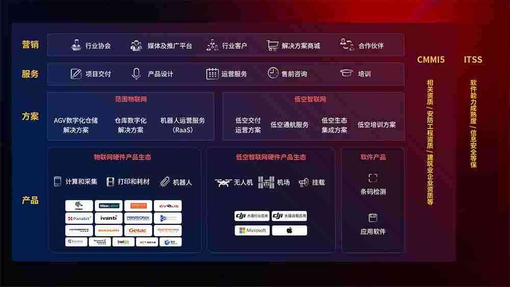 聚合国内外先进的物联网硬件产品品牌,,,聚焦数字化仓储、、、、机器人运营、、低空智联网等领域,,,,共同打造适合客户业务场景的解决方案并提供交付服务