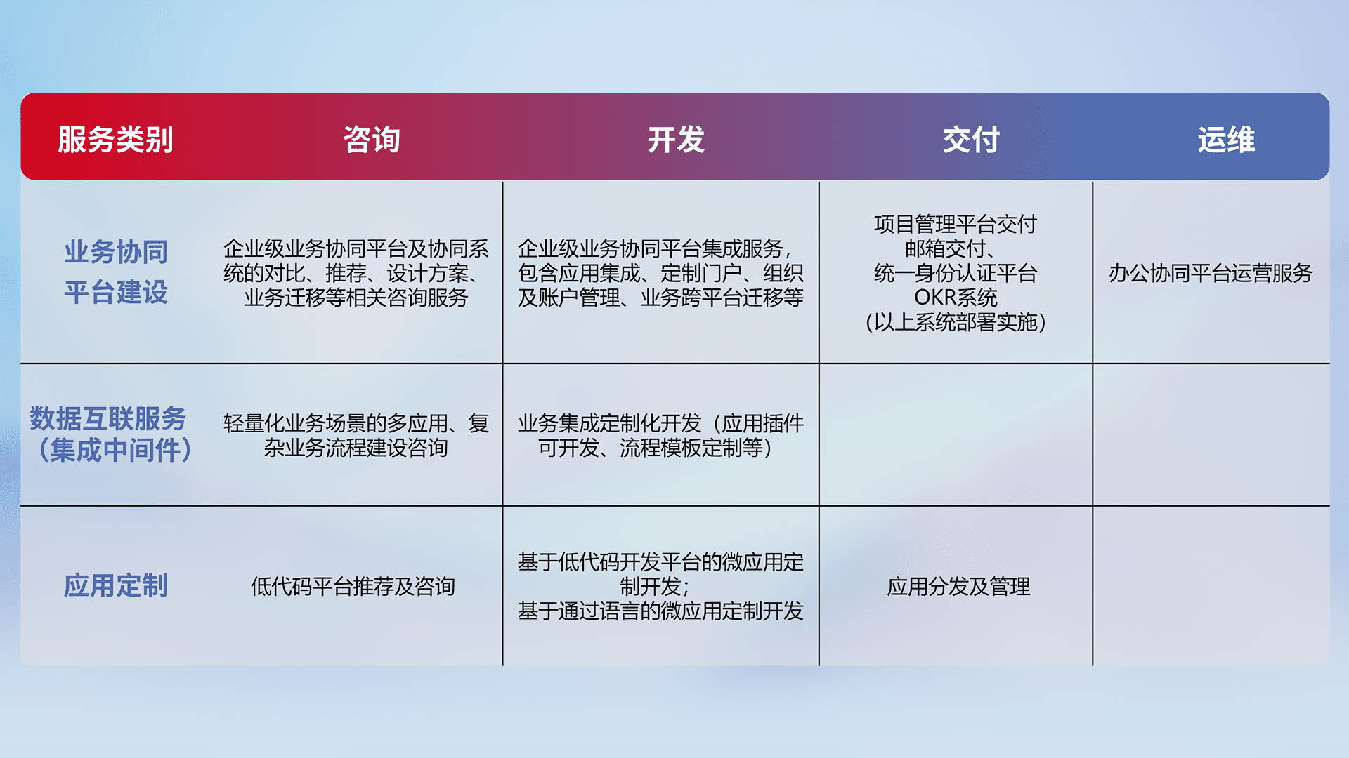 针对钉钉、、、企微、、、IDaas等平台级产品提供产品的规划、、方案、、、交付、、定制化开发等服务,,实现如统一协同办公、、智能客户服务、、、、混合会议管理、、、、智能数据查询、、、、等业务场景,,实现数字化转型。。